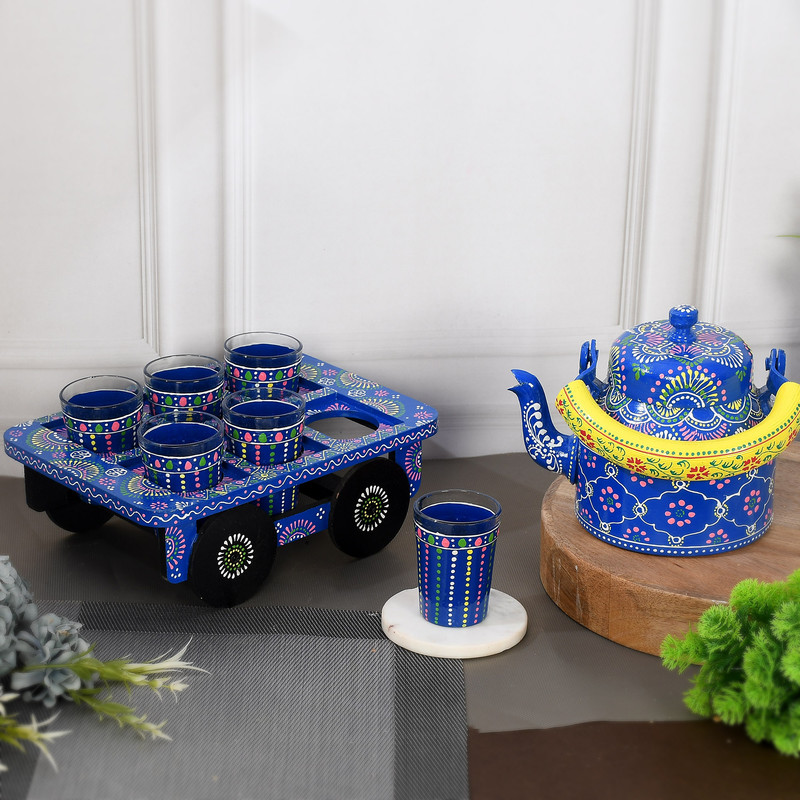 HandPainted Alluminium Tea Kettle with 6 Glasses and Wooden Tray For Home Decor , Tea Party , Serving