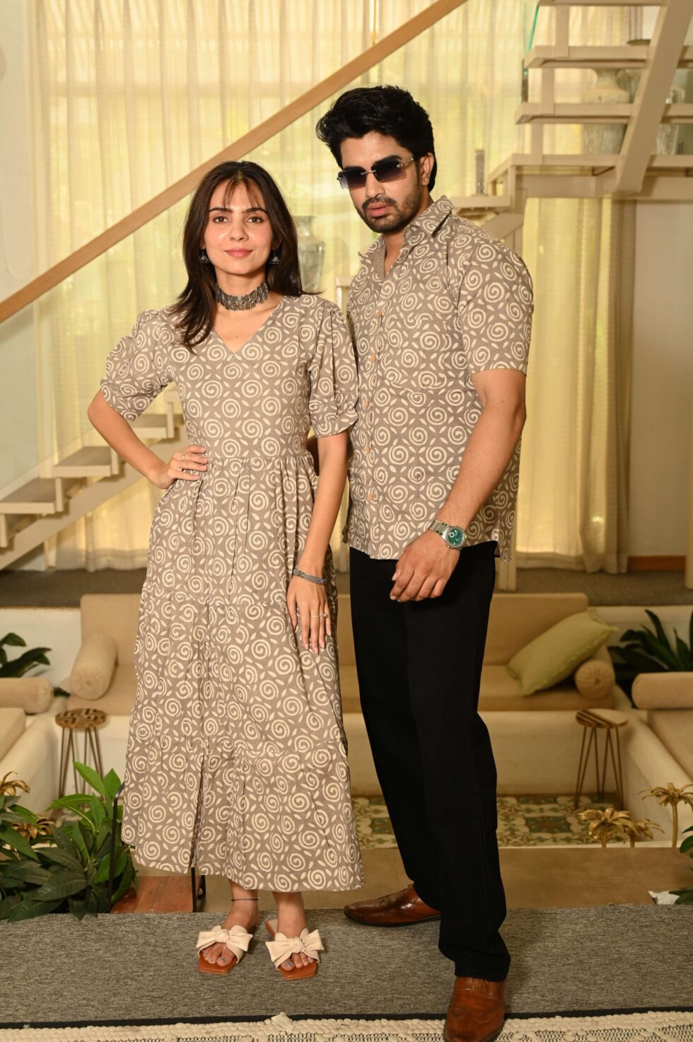 Couple Matching Beige Cotton Anarkali Midi Dress and Shirt Set ? Swirl Block Print