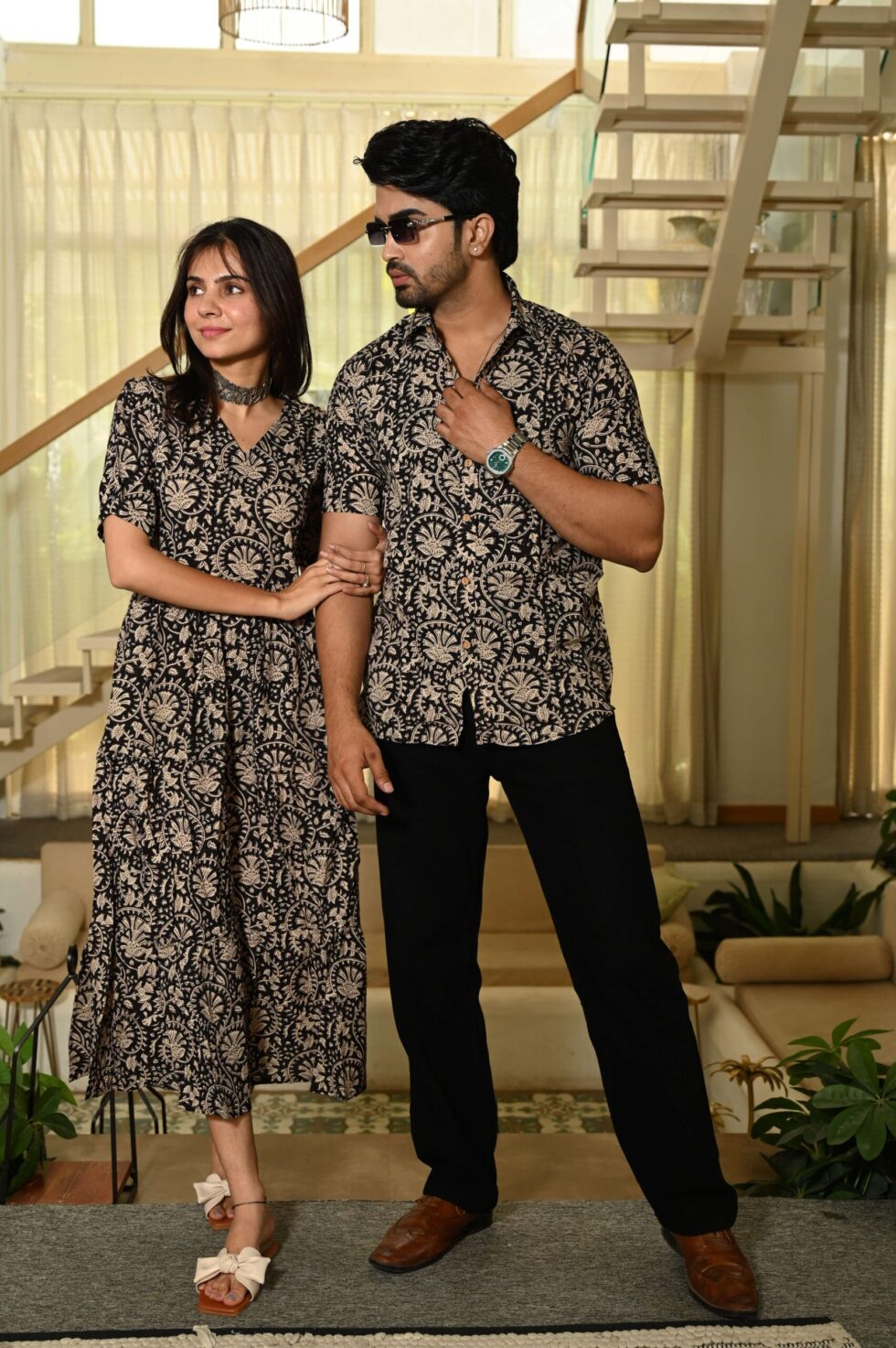 This Black floral Printed couple matching outfit includes a women?s flowy cotton midi dress and a men?s short-sleeve printed shirt. Designed with cheerful floral prints, this set is perfect for summer outings, casual gatherings, or twinning on vacations.