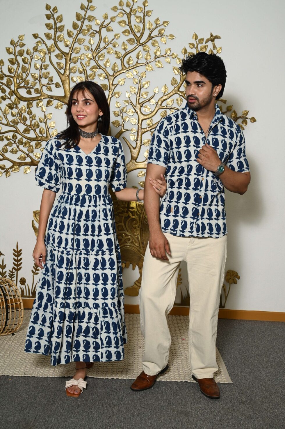 This White And Blue Printed couple matching outfit includes a women?s flowy cotton midi dress and a men?s short-sleeve printed shirt. Designed with cheerful yellow floral prints, this set is perfect for summer outings, casual gatherings, or twinning on vacations.