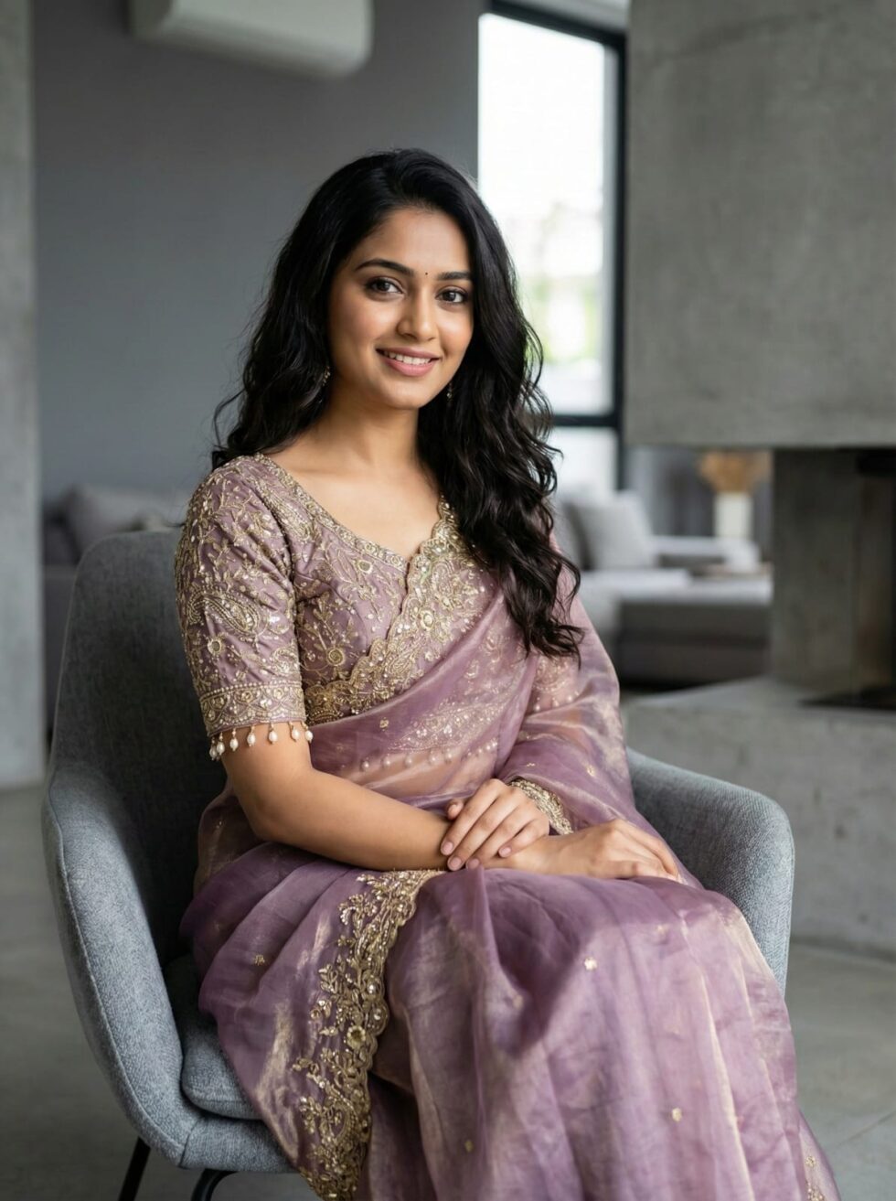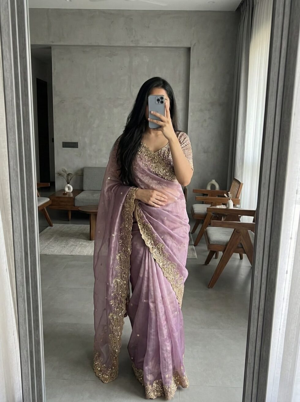Soft Fandy Satin Saree With Embroidery Sequence And Scallop Border, Stitched Blouse Of Soft Fandy Satin With Front, Back And Sleeves Embroidery Sequence