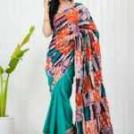 Women’s Multicolor Patchwork Printed Saree with Green Base Blouse Piece Elegant Ethnic Wear